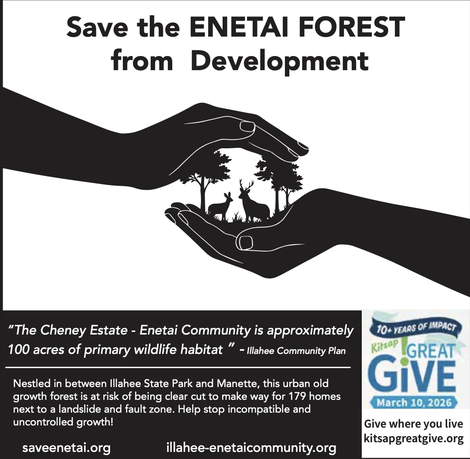 Due to pressing and ongoing family medical concerns, SAVE ENETAI is seeking candidate for Plan Amendment Co-Coordinator which will liaison with Kitsap County Department of County Development (DCD) and have oversight of this process. Preferred qualifications are planning and/or strategic plan background familiar with zoning who can keep within the scope of the approved proposal. Most importantly are skills and patience to deal with the challenges of county government. Administrative support and small grant is provided. Please reach out so we can keep this process moving forward.